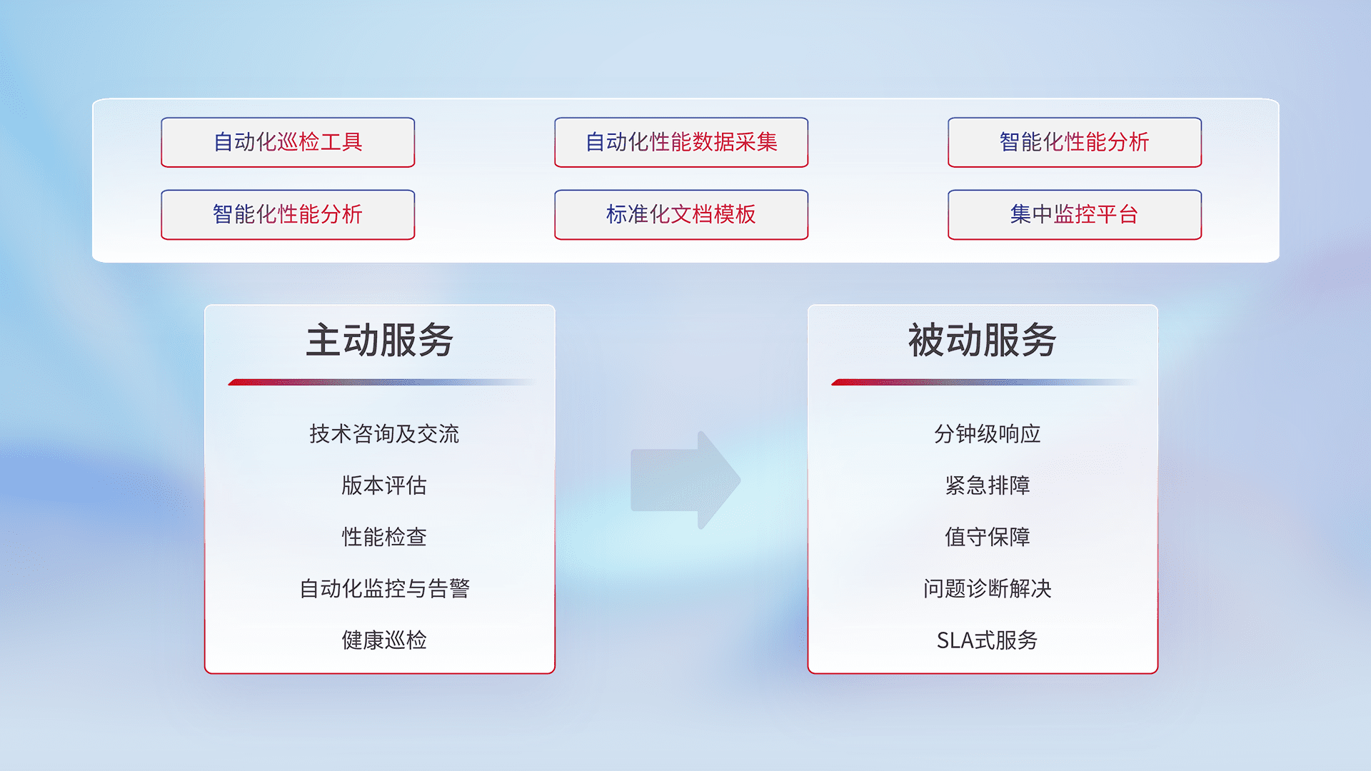 智能化工具和标准化文档,,保障服务质量,,,提供主动服务(包含技术咨询、、、、版本评估、、、性能检查、、自动化监控与告警、、、健康巡检)和被动服务包含(分钟级响应、、紧急排障、、、值守保障、、、、问题诊断解决、、SLA服务)。。